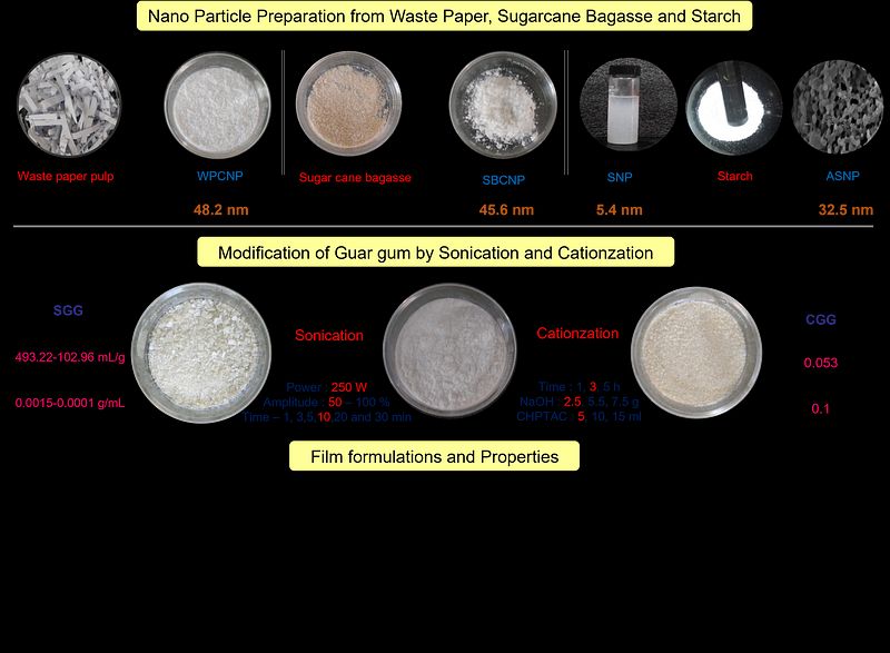 This project is a collaborative effort to create a replacement to petroleum based plastic packaging. Guar gum, starch and cellulose nanoparticles were studied as raw materials for the preparation of biodegradable films. Their potential to be used in conventional manufacturing units were explored.